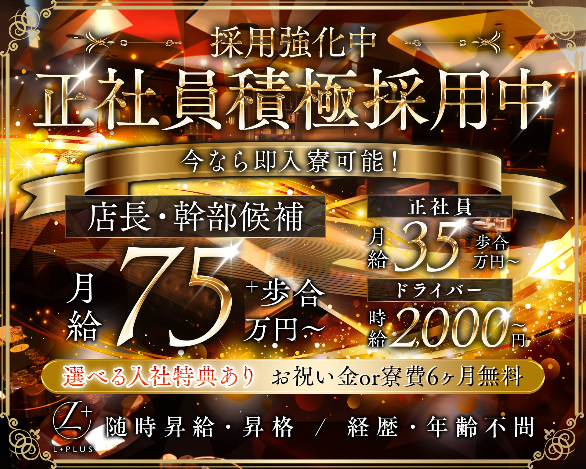 | 待遇 | ◆日払いOK ◆40代・50代も活躍中 ◆随時昇給・昇格あり ◆体験入社OK ◆送りあり ◆制服貸与 ◆交通費支給 ◆女性も大歓迎 ◆車通勤OK ◆面接交通費全額支給 【社】 ◆マンション寮完備(6カ月無料)or入店お祝い金あり ◆社会保険完備 ◆賞与あり ◆独立支援制度あり ◆有給休暇あり(月1回) 【ア】 ◆掛け持ち・Wワーク大歓迎 ◆週2~3日からの出勤OK |