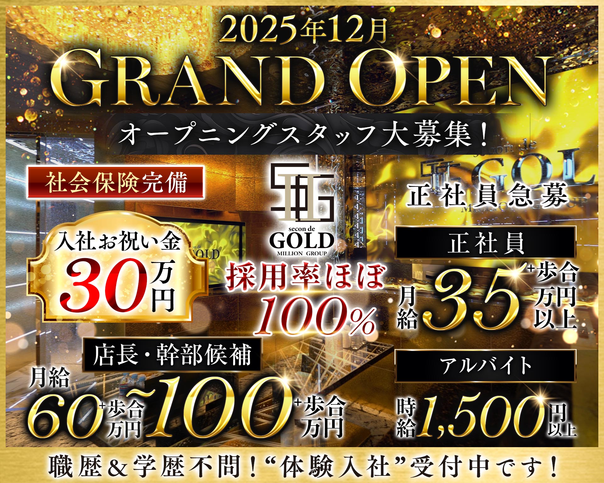 | 待遇 | ◆日払いOK ◆寮完備 ◆40代・50代歓迎 ◆社会保険完備 ◆随時昇給・昇格あり ◆体験入社OK ◆ボーナス年2回あり ◆送りあり ◆制服貸与 ◆社員旅行あり ◆皆勤手当あり ◆レクリエーションあり ◆家族手当あり ◆役職手当あり ◆まかない制度あり ◆独立支援制度あり ◆女性も大歓迎 ◆入社祝い金30万円贈呈 |