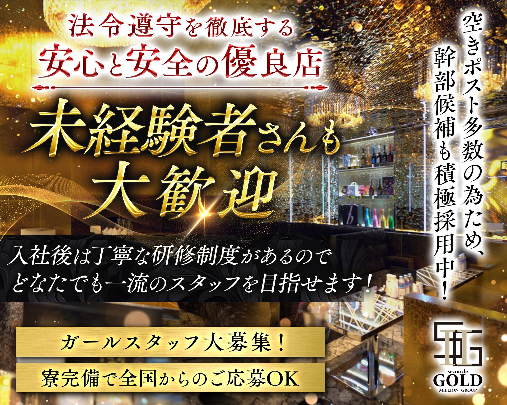 | 待遇 | ◆日払いOK ◆40代・50代歓迎 ◆随時昇給・昇格あり ◆体験入社OK ◆制服貸与 ◆レクリエーションあり ◆まかない制度あり ◆女性も大歓迎 ◆皆勤手当あり 【社】 ◆寮完備 ◆社会保険完備 ◆賞与あり ◆送りあり ◆社員旅行あり ◆家族手当あり ◆役職手当あり ◆独立支援制度あり ◆入社祝い金30万円贈呈 【ア】 ◆掛け持ち・Wワーク大歓迎 ◆週1日からの出勤OK |
